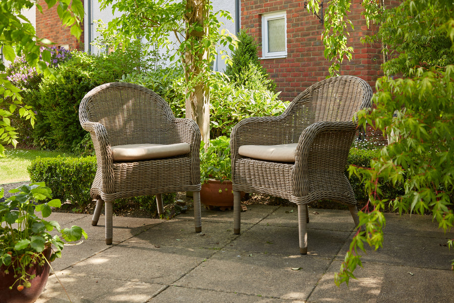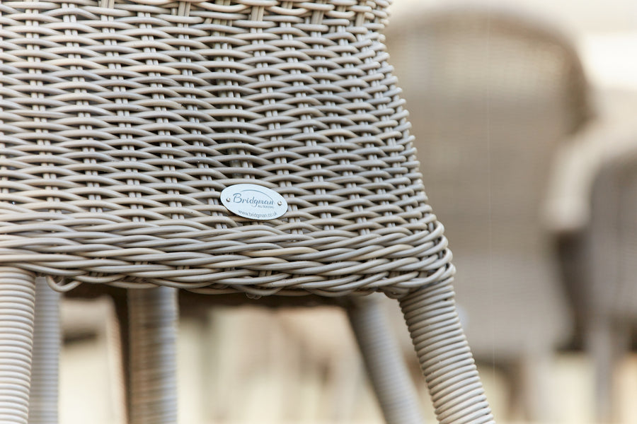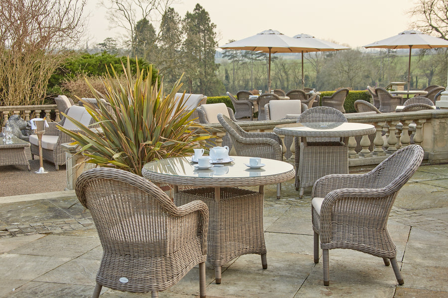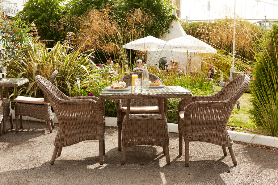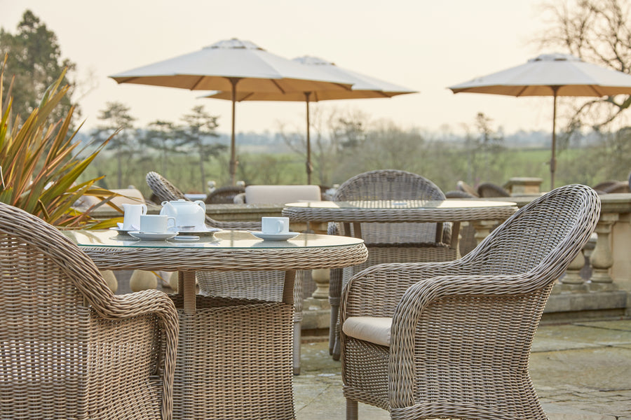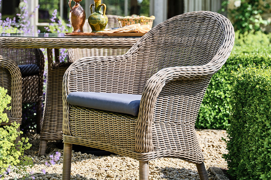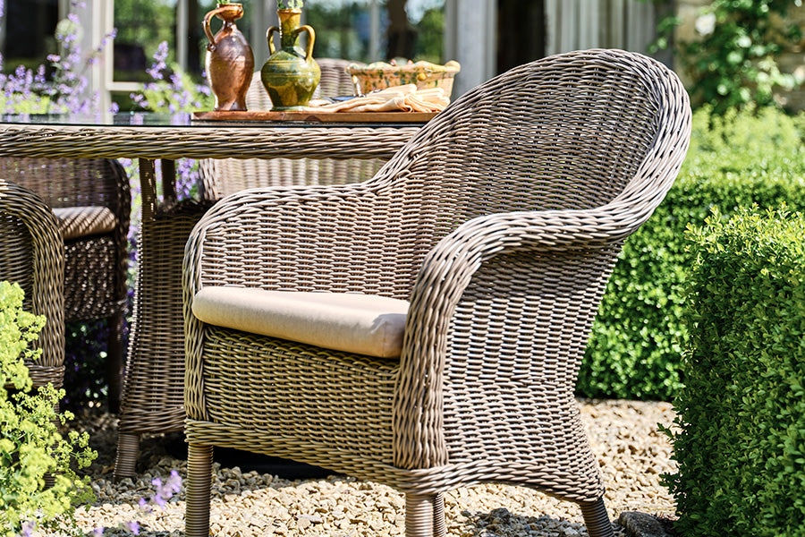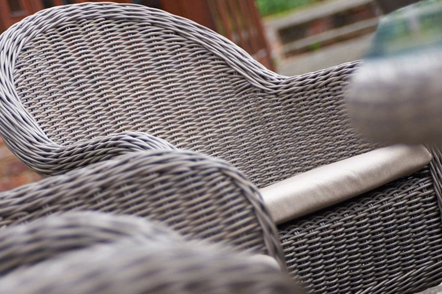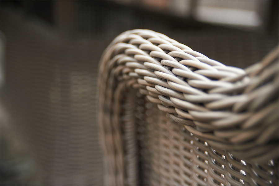 Recyclable, rustproof powder-coated aluminium frame. Premium scratchproof synthetic all seasons rattan. Mushroom Brown weave. Handwoven. UV-resistant to over 5000 UV hours. Resistant to extreme temperatures from -70°C to +80°C with no fading, cracking or splitting. Tested to 50,000 uses. Fully waterproof cushions in Beige or Grey. -