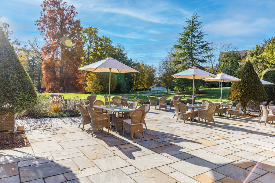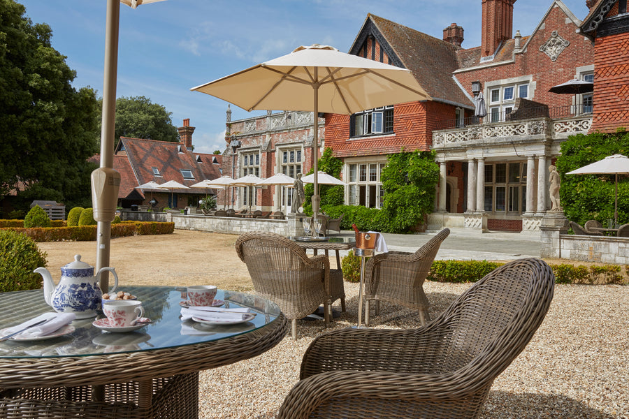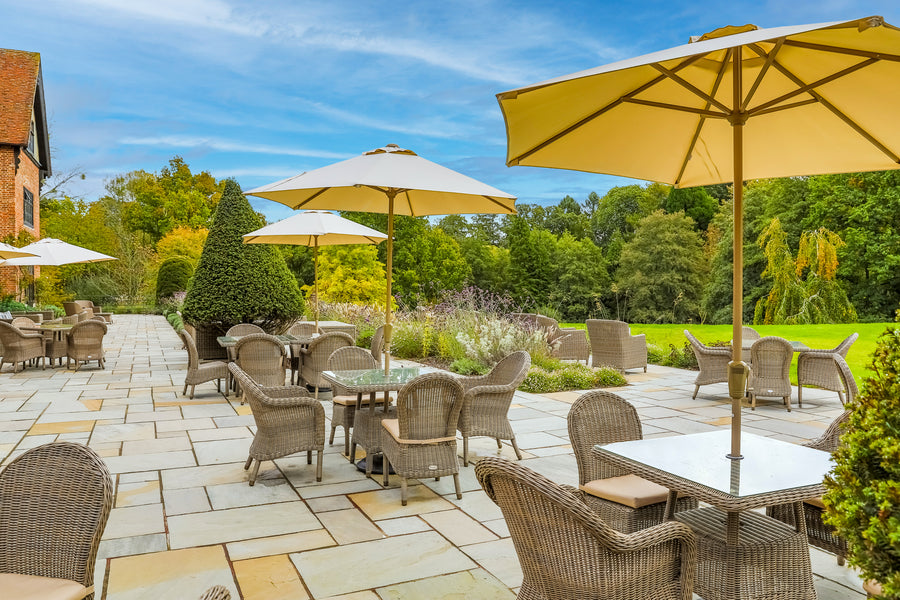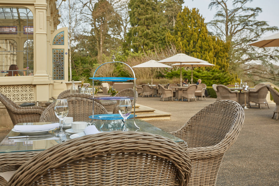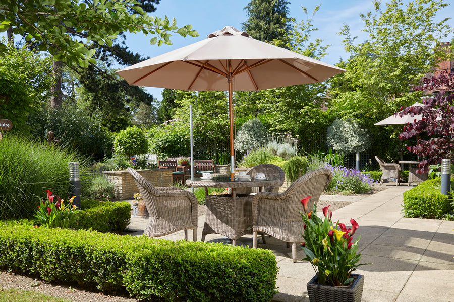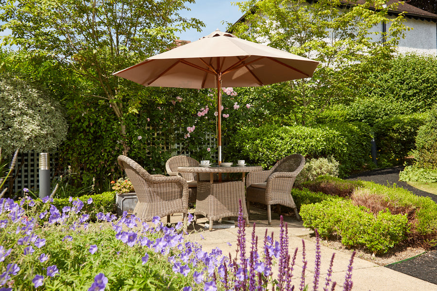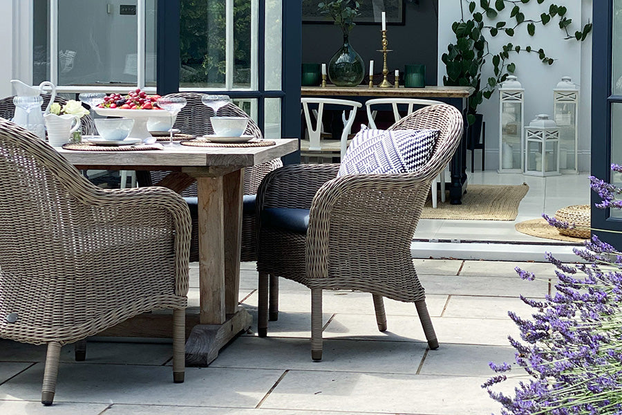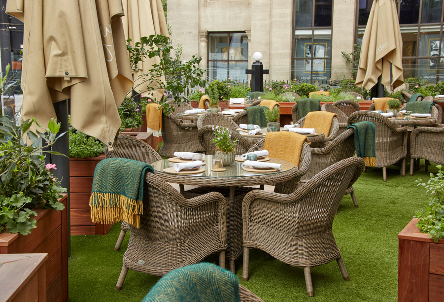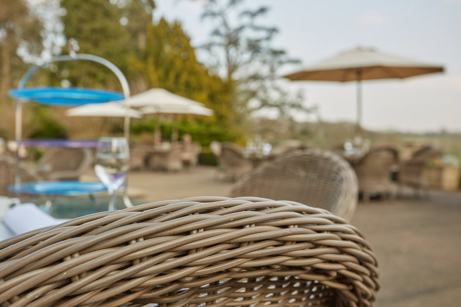 Recyclable, rustproof powder-coated aluminium frame. Premium scratchproof synthetic all seasons rattan. Mushroom Brown weave. Handwoven. UV-resistant to over 5000 UV hours. Resistant to extreme temperatures from -70°C to +80°C with no fading, cracking or splitting. Tested to 50,000 uses. Fully waterproof cushions in Beige or Grey. -