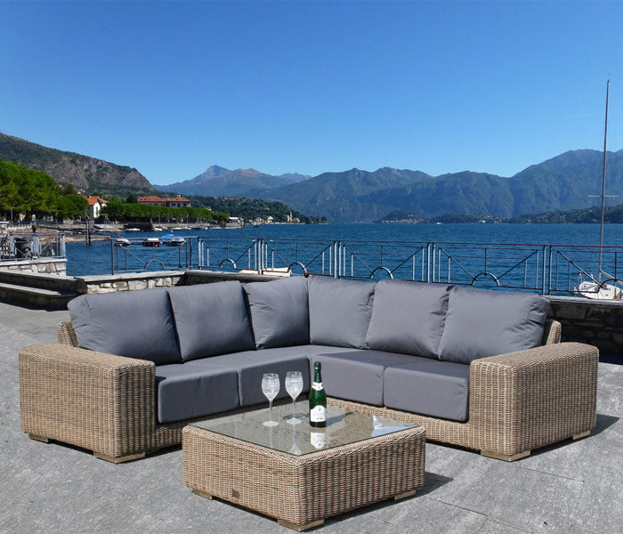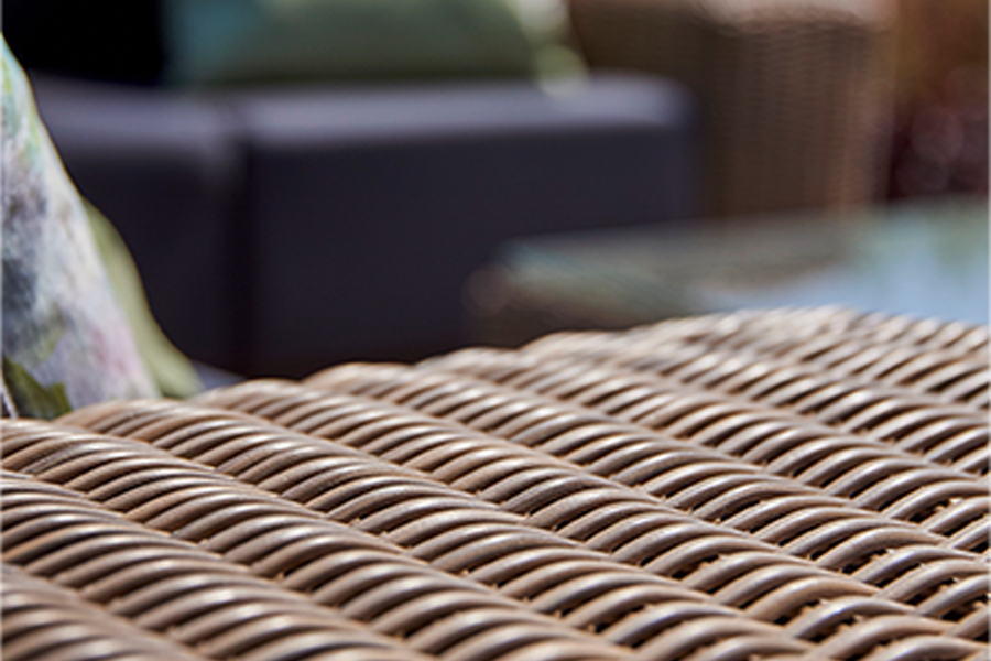 Recyclable, rustproof powder-coated aluminium frame. Premium scratchproof synthetic all seasons rattan. Mushroom Brown weave. Handwoven. UV-resistant to over 5000 UV hours. Resistant to extreme temperatures from -70°C to +80°C with no fading, cracking or splitting. Tested to 50,000 uses. Fully waterproof cushions in Beige or Grey. -