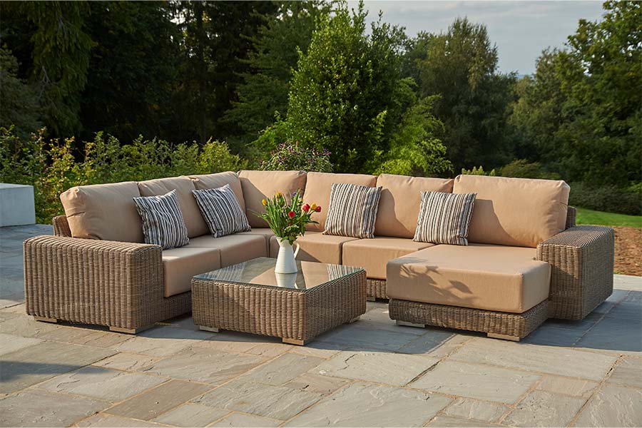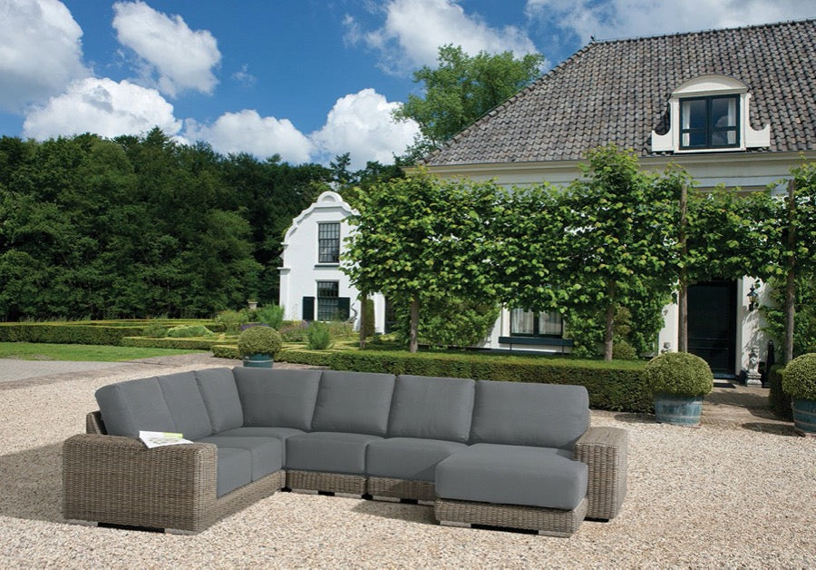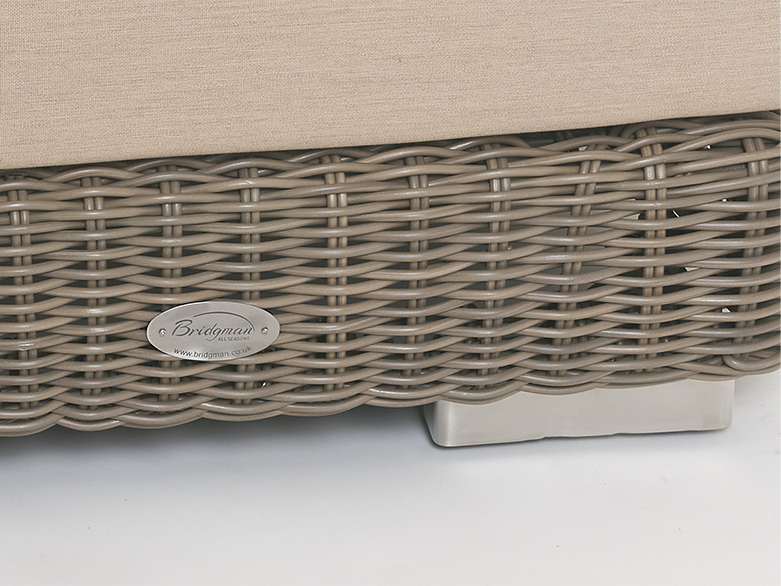 Recyclable, rustproof powder-coated aluminium frame. Premium scratchproof synthetic all seasons rattan. Mushroom Brown weave. Handwoven. UV-resistant to over 5000 UV hours. Resistant to extreme temperatures from -70°C to +80°C with no fading, cracking or splitting. Tested to 50,000 uses. Fully waterproof cushions in Beige or Grey. -