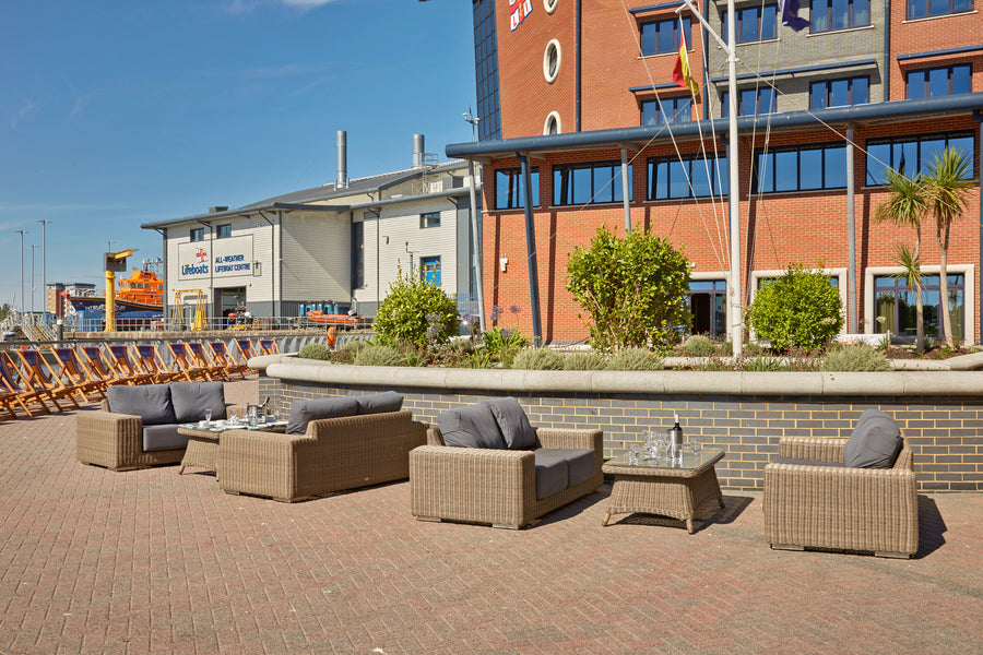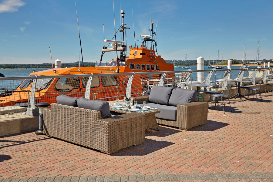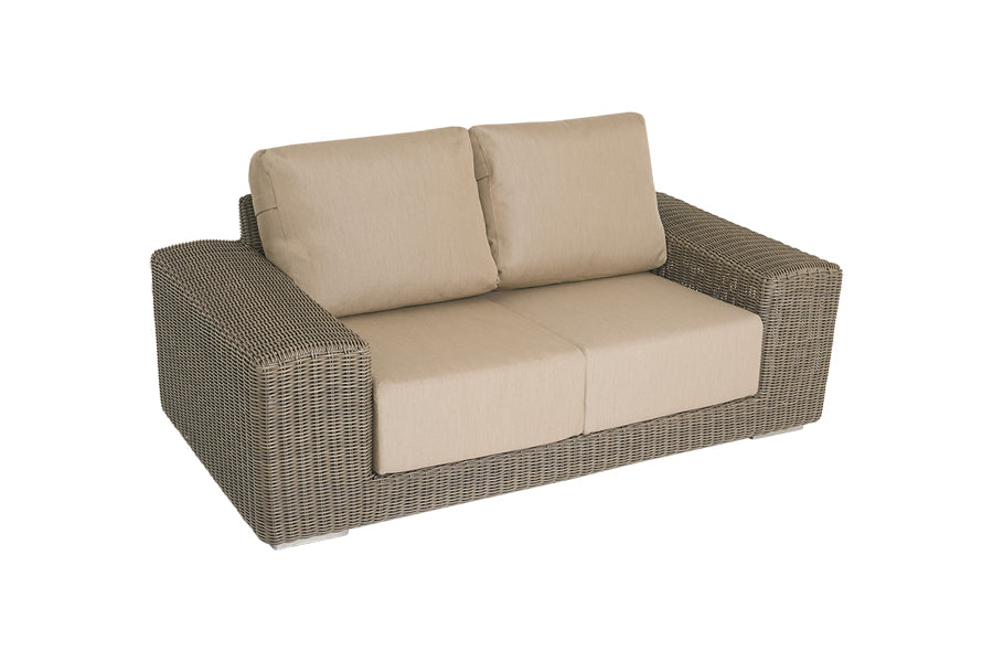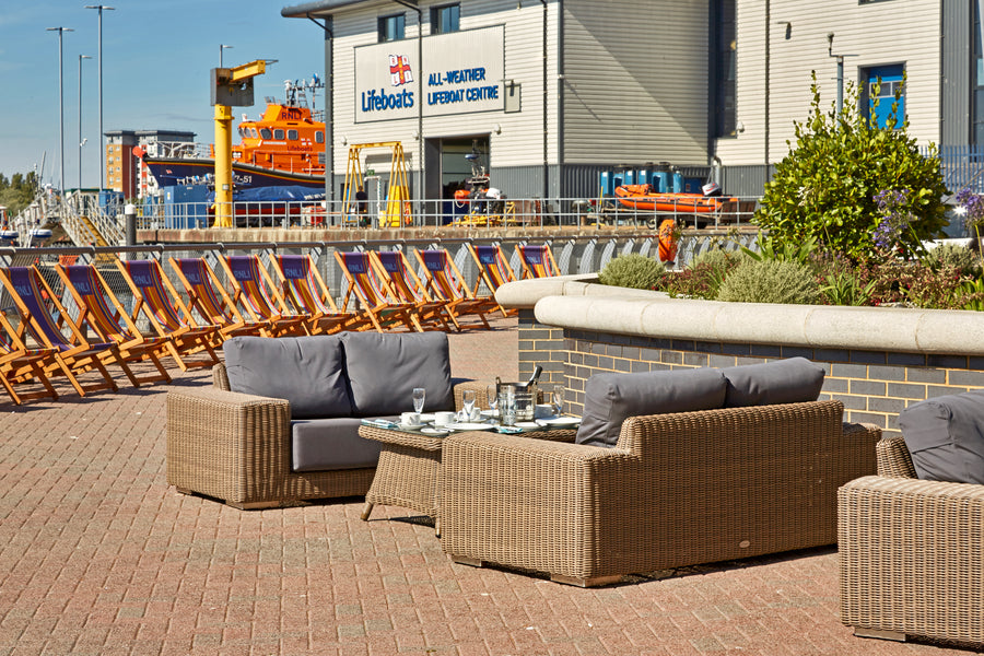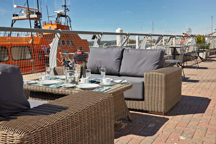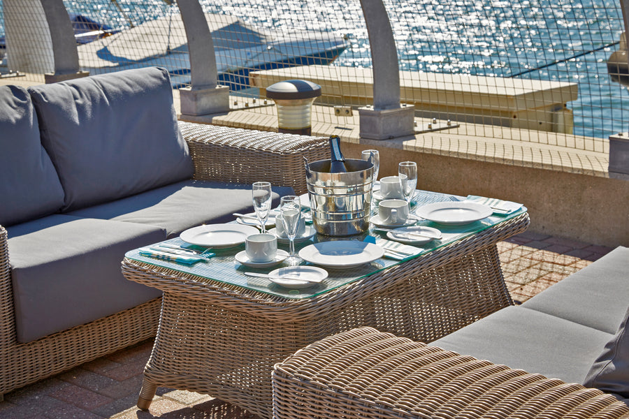 Recyclable, rustproof powder-coated aluminium frame. Premium scratchproof synthetic all seasons rattan. Mushroom Brown weave. Handwoven. UV-resistant to over 5000 UV hours. Resistant to extreme temperatures from -70°C to +80°C with no fading, cracking or splitting. Tested to 50,000 uses. Fully waterproof cushions in Beige or Grey. -
