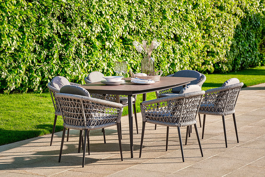 Recyclable, rustproof aluminium frame in Charcoal. Ceramic slate and safety glass bonded tabletop. Castors on each foot to prevent scratching on floor. -