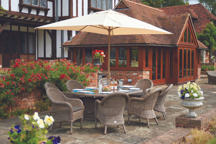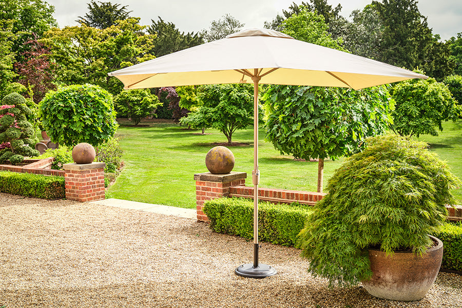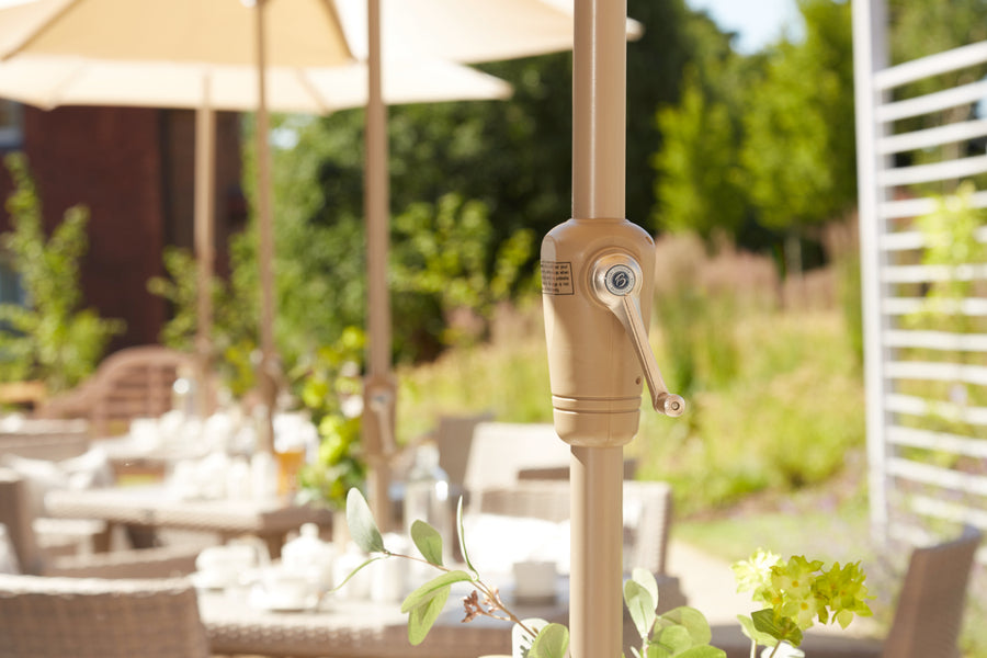 Resilient Almond fabric. Easy to wind up and down with a crank handle. Combines beautifully with medium and large oval tables. Comes with a free Premium Parasol Cover. Must always be safely anchored. For safety reasons, this parasol should never be left up whilst unattended or erected in breezy conditions. -