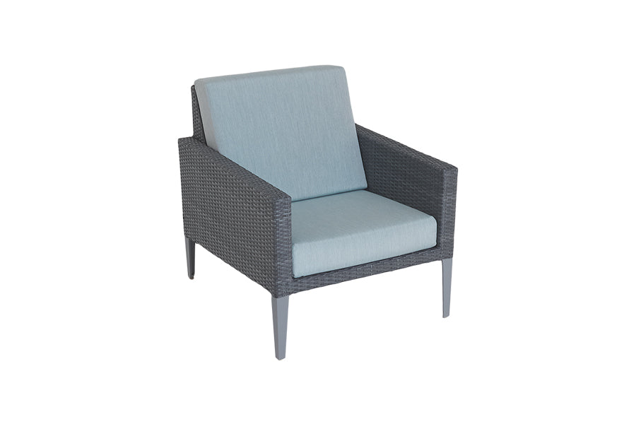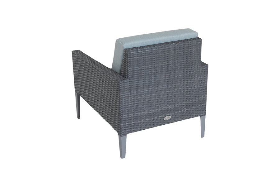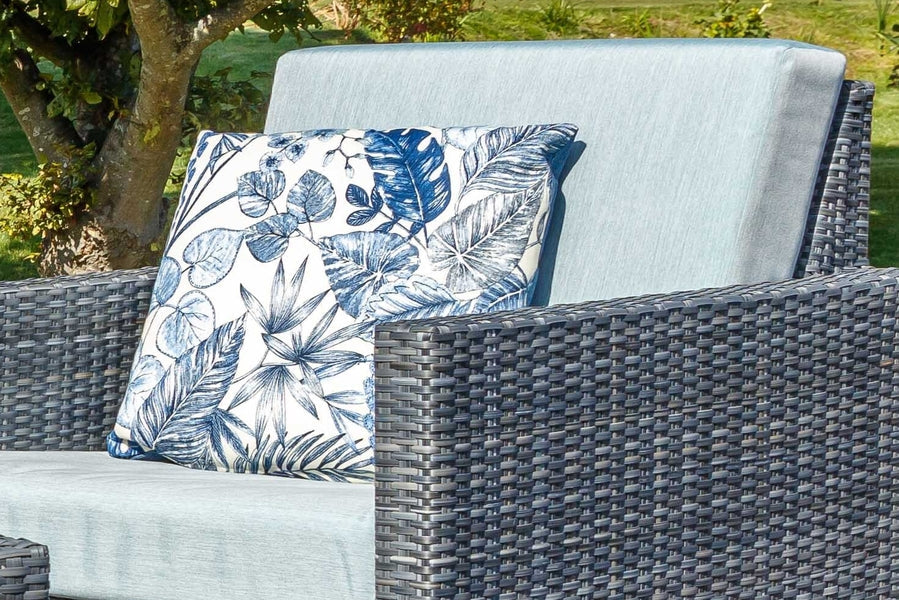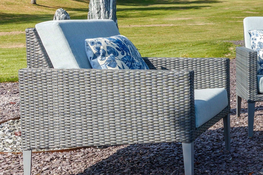 Recyclable, rustproof powder-coated aluminium frame. Premium scratchproof synthetic all seasons rattan. Grey coloured weave. Handwoven. UV-resistant to over 5000 UV hours. Resistant to extreme temperatures from -70°C to +80°C with no fading, cracking or splitting. Tested to 50,000 uses. Fully waterproof cushions in Aqua Grey. -
