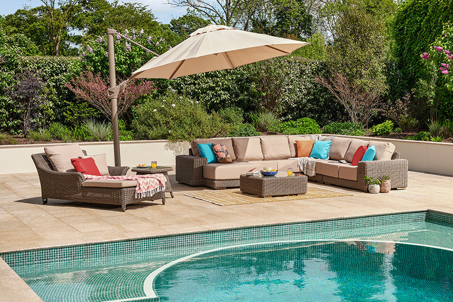 Recyclable, rustproof powder-coated aluminium frame. Premium scratchproof synthetic all seasons rattan. Mushroom Brown weave. Handwoven. UV-resistant to over 5000 UV hours. Resistant to extreme temperatures from -70°C to +80°C with no fading, cracking or splitting. Tested to 50,000 uses. Fully waterproof cushions in Beige or Grey. -