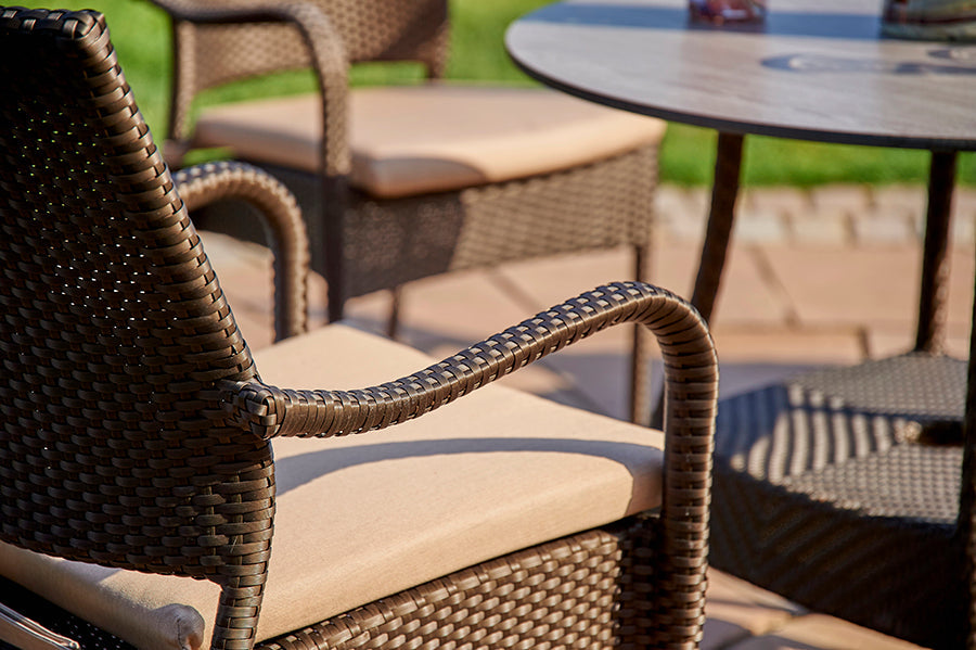 Recyclable, rustproof powder-coated aluminium frame. Premium scratchproof synthetic all seasons rattan. Bronze coloured weave. Handwoven. UV-resistant to over 5000 UV hours. Antibacterial, easy-to-clean wood-effect HPL tabletop. Resistant to extreme temperatures from -70°C to +80°C with no fading, cracking or splitting. -