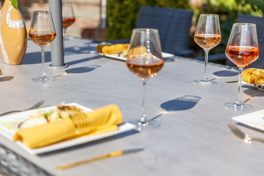Recyclable, rustproof powder-coated aluminium frame. Premium scratchproof synthetic all seasons rattan. Grey coloured weave. Handwoven. UV-resistant to over 5000 UV hours. Antibacterial, easy-to-clean wood-effect HPL tabletop. Resistant to extreme temperatures from -70°C to +80°C with no fading, cracking or splitting. -