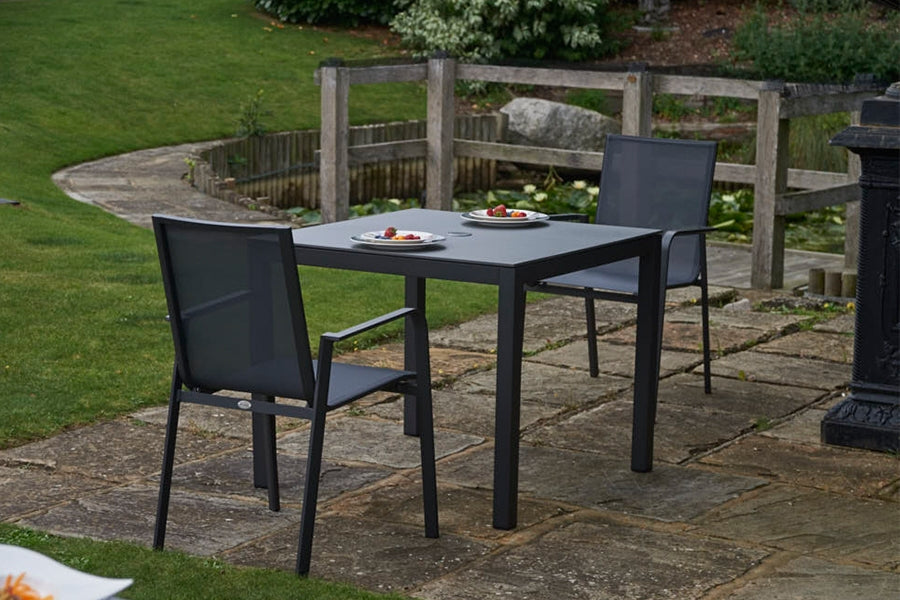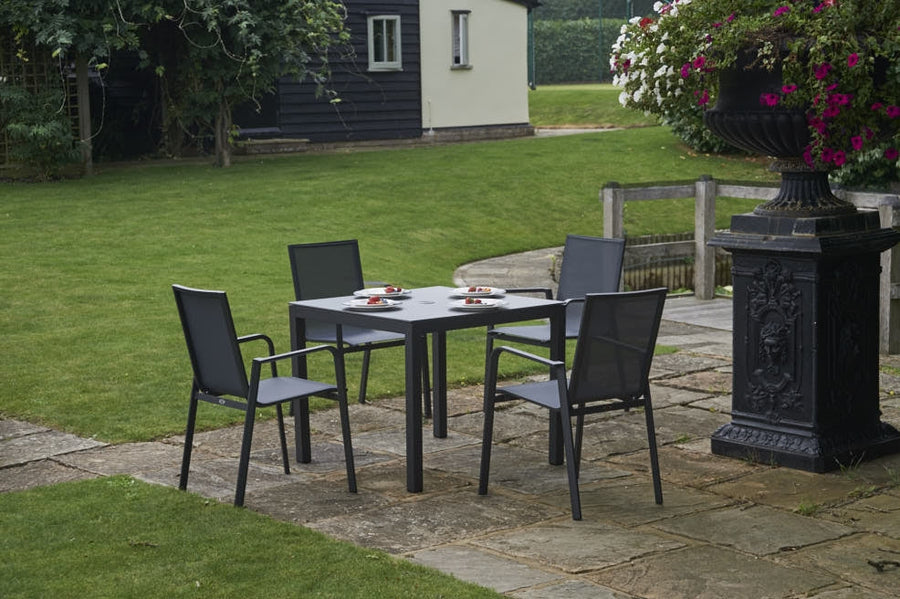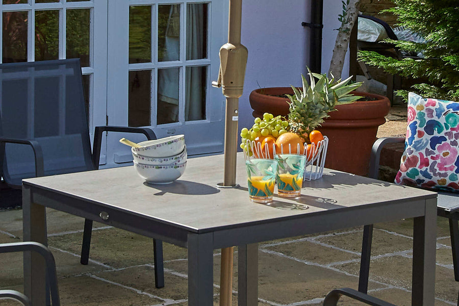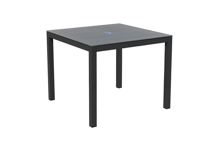 Recyclable, rustproof, low-maintenance frame. Dark Anthracite Grey powder-coated aluminium construction. Chic HPL tabletop. Central parasol hole. -