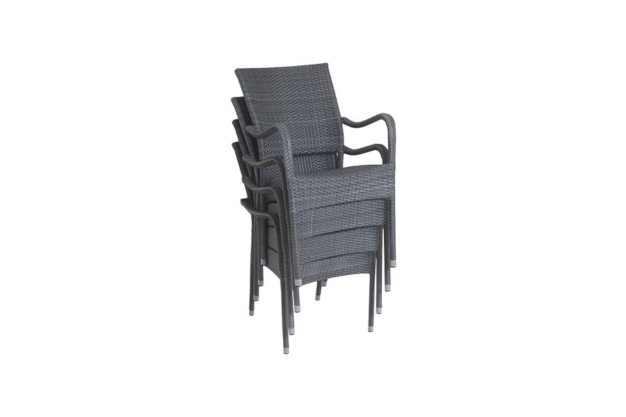 Recyclable, rustproof powder-coated aluminium frame. Premium scratchproof synthetic all seasons rattan. Grey coloured weave. Handwoven. UV-resistant to over 5000 UV hours. Resistant to extreme temperatures from -70°C to +80°C with no fading, cracking or splitting. Tested to 50,000 uses. Conveniently stackable design. Optional fully waterproof cushions in Grey. -