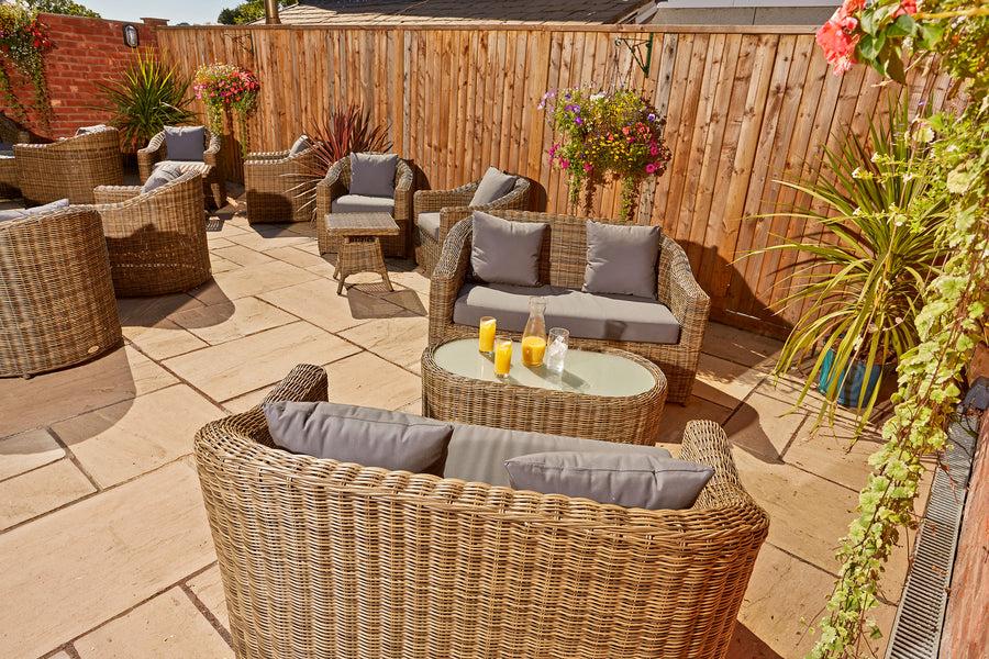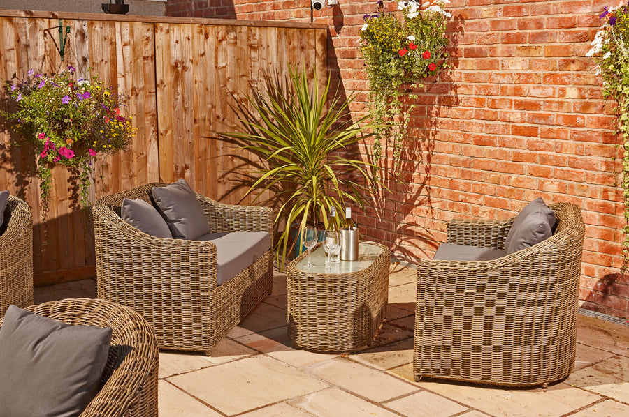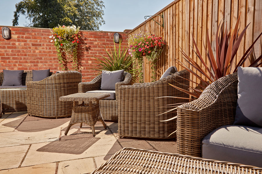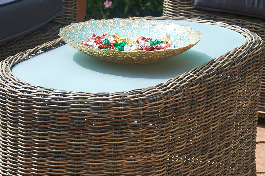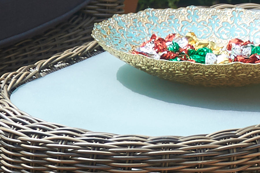 Recyclable, rustproof powder-coated aluminium frame. Synthetic Olive Brown rattan. UV-resistant to over 2000 UV hours. Safety glass tabletop. -