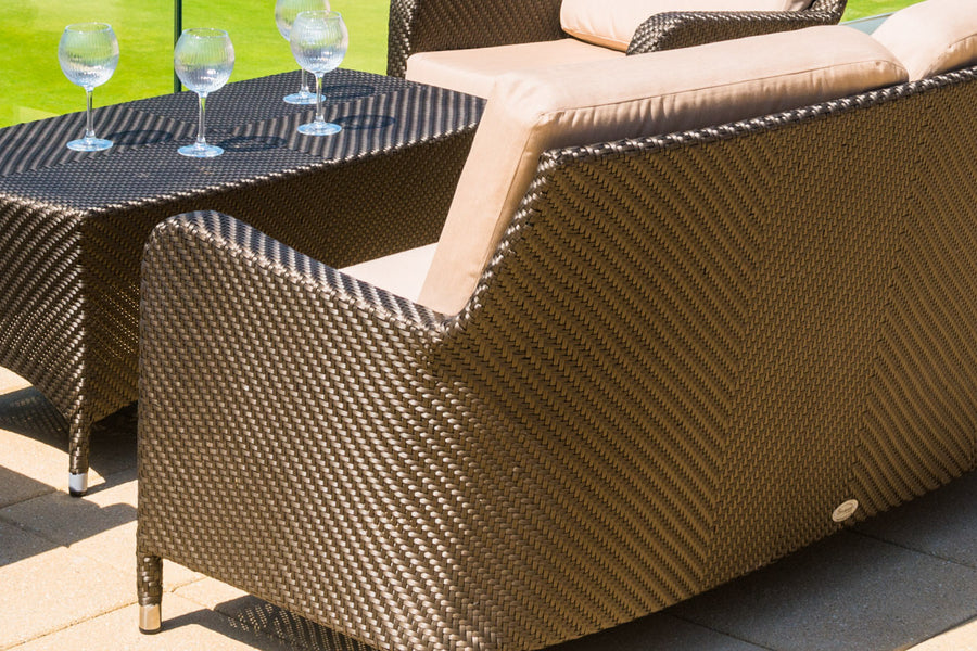 Recyclable, rustproof powder-coated aluminium frame. Premium scratchproof synthetic all seasons rattan. Bronze coloured weave. Handwoven. UV-resistant to over 5000 UV hours. Resistant to extreme temperatures from -70°C to +80°C with no fading, cracking or splitting. Tested to 50,000 uses. Fully waterproof cushions in Beige. -