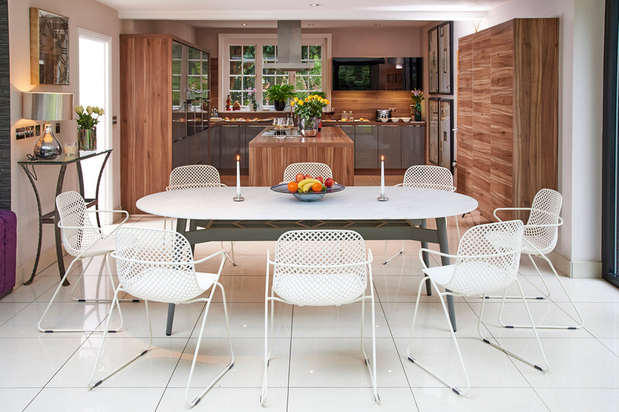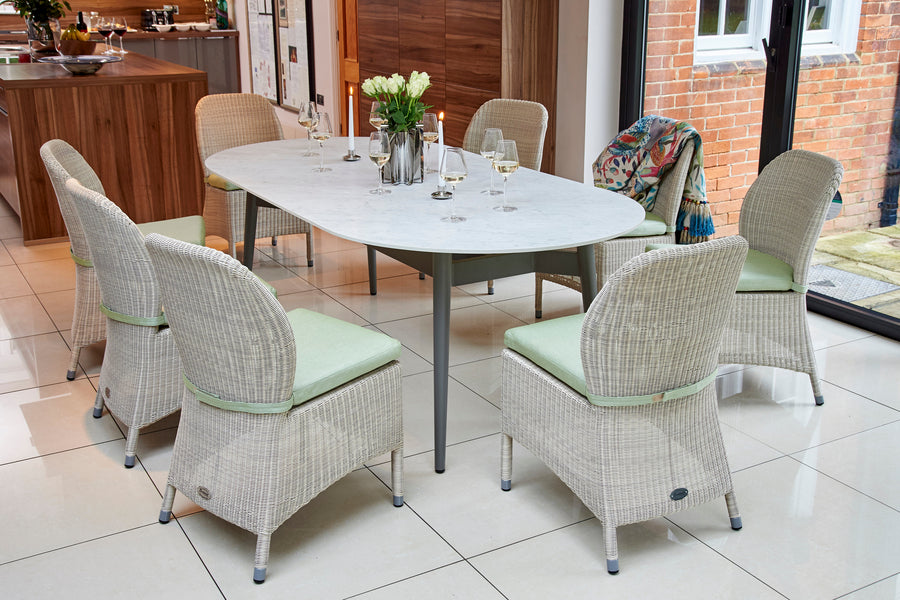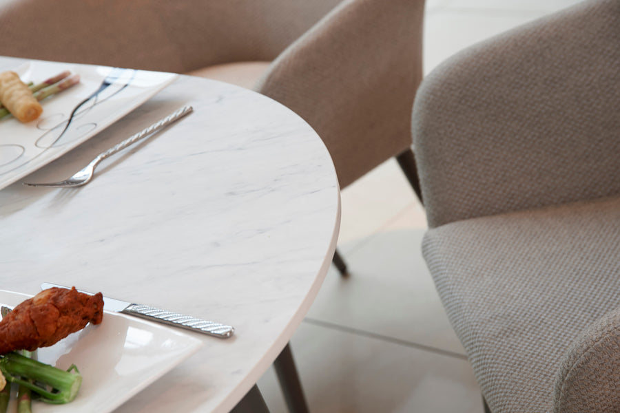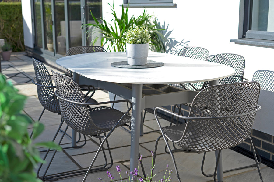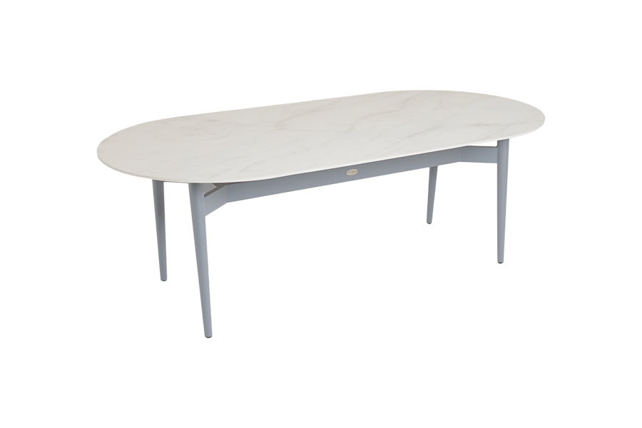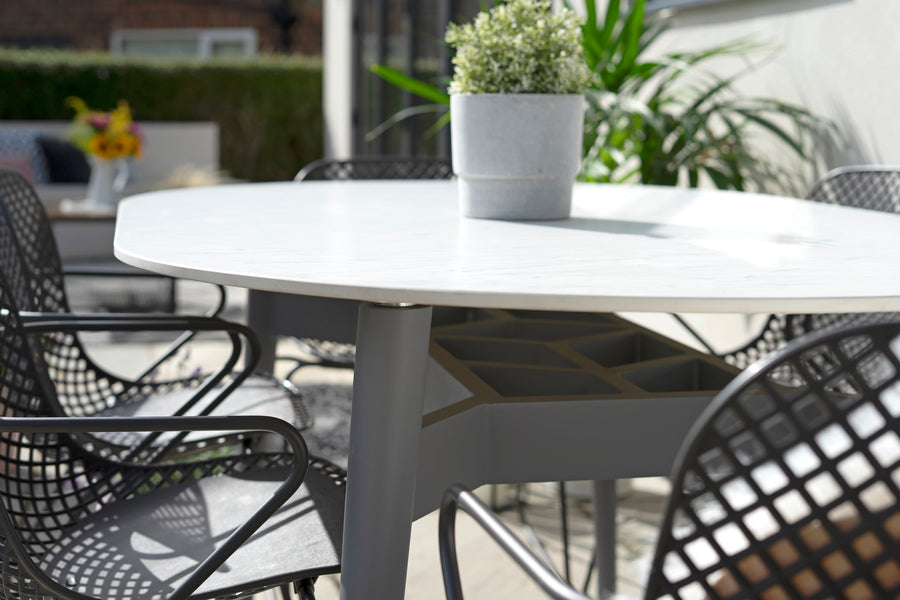 Stainproof, easy-to-clean porcelain marble tabletop. Sturdy aluminium legs. Seats up to 8 people. Contemporary design. -