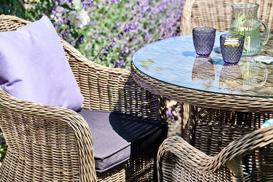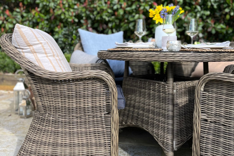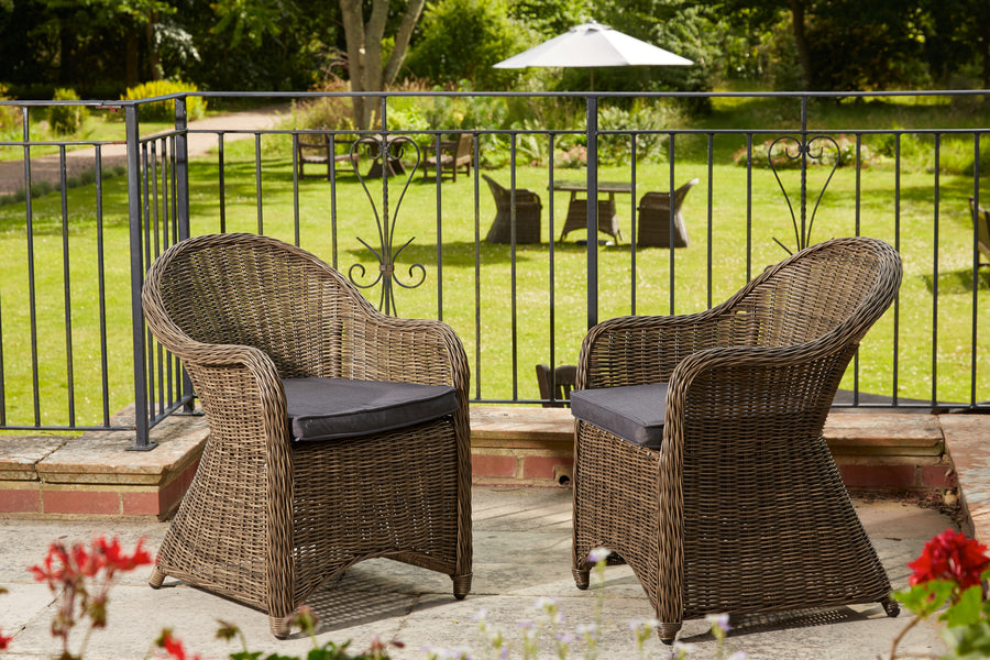 Recyclable, rustproof powder-coated aluminium frame. Synthetic Olive Brown rattan. UV-resistant to over 2000 UV hours. Cosy grey seat cushions. -